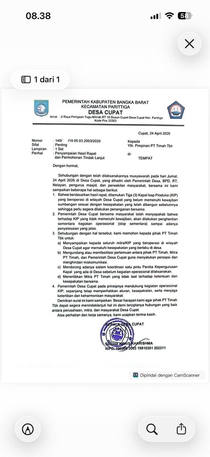 Permintaan itu disampaikan melalui surat resmi Pemerintah Desa Cupat tertanggal 24 April 2026 yang ditujukan kepada pimpinan PT Timah Tbk.