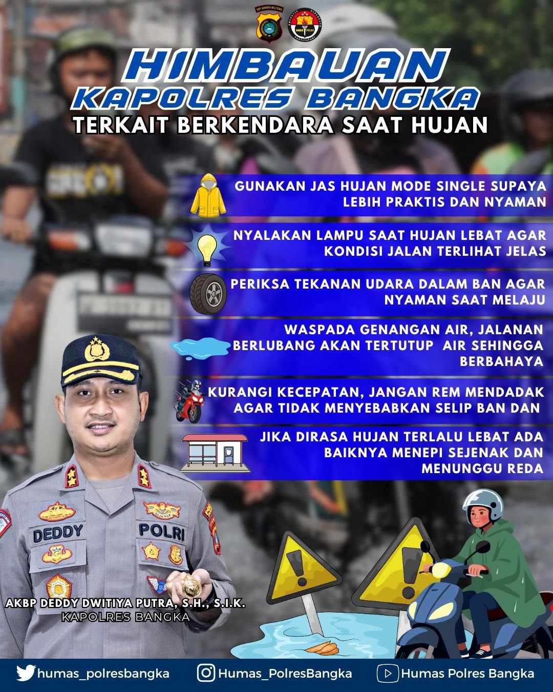 CyberNews Bangka โ€” Dalam upaya meningkatkan keselamatan masyarakat di jalan raya, Kapolres Bangka AKBP Deddy Dwitya Putra, S.H., S.I.K. mengeluarkan himbauan khusus kepada para pengendara motor maupun mobil untuk lebih berhati-hati saat berkendara di tengah kondisi cuaca hujan yang kerap terjadi belakangan ini.