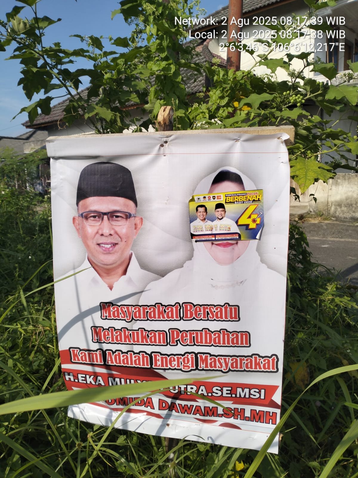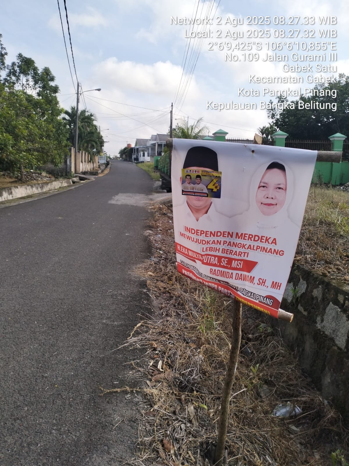 Peristiwa ini terjadi di sejumlah titik, termasuk di kawasan Gabek Permai, Kecamatan Gabek. Di lokasi tersebut, APK Merdeka yang sebelumnya berdiri dengan rapi dan utuh kini tampak dirusak estetikanya dengan penempelan stiker-stiker dari paslon lain.