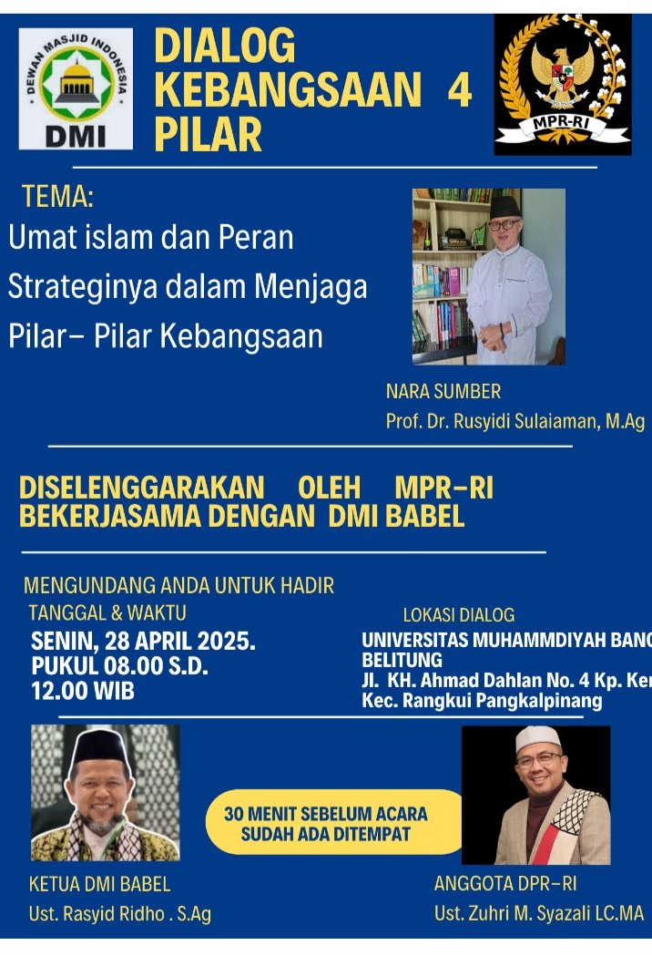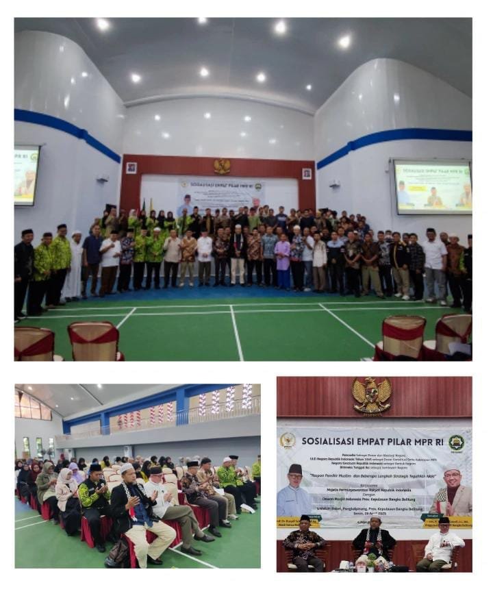 CyberNews Bangka Belitung – Majelis Permusyawaratan Rakyat Republik Indonesia (MPR RI) bersama Dewan Masjid Indonesia (DMI) Provinsi Kepulauan Bangka Belitung menggelar sosialisasi Empat Pilar Kebangsaan, Senin (28/4/2025). Kegiatan ini berlangsung di Auditorium Universitas Muhammadiyah Bangka Belitung, dari pukul 08.30 hingga 12.00 WIB.