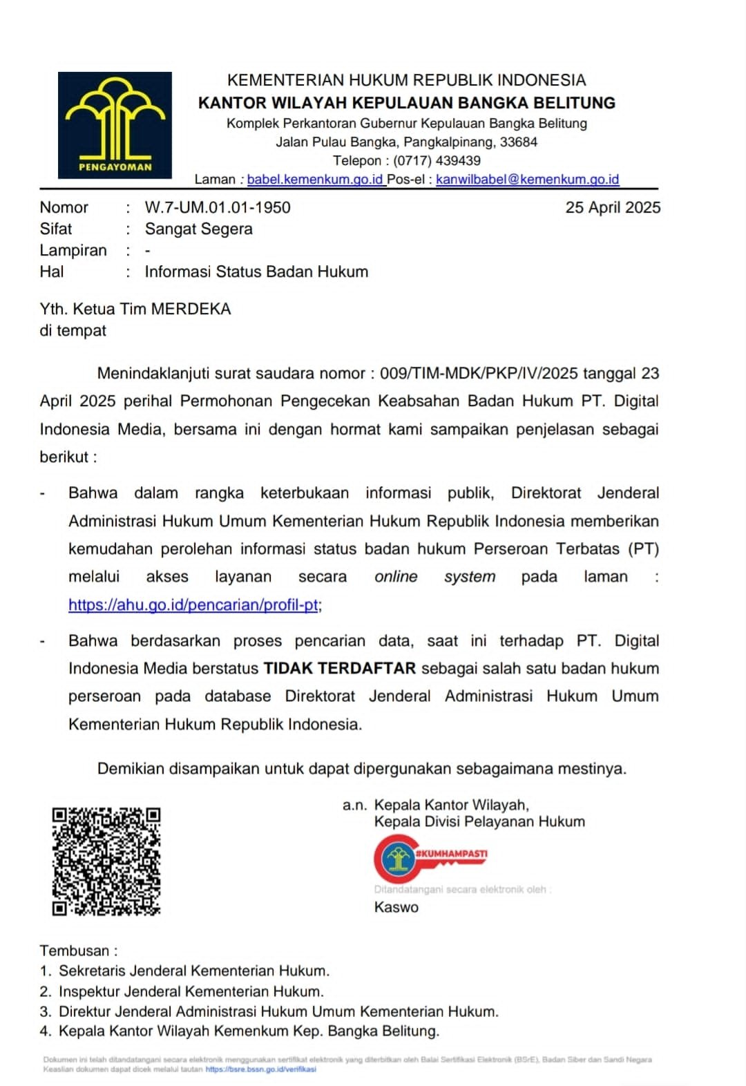 Surat dari Kemenkum RI Wilayah Babel terkait Informasi Status Badan Hukum