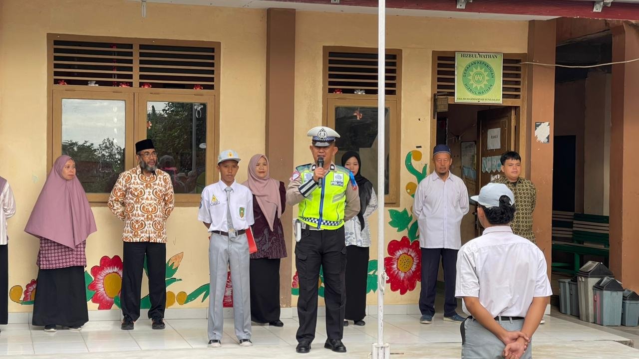 CyberNewsBangka, Sungailiat — Satuan Lalu Lintas (Satlantas) Polres Bangka melaksanakan kegiatan pembinaan dan penyuluhan kepada pelajar dengan bertindak sebagai Inspektur Upacara di SMA Muhammadiyah Sungailiat, Senin (02/02/2026).