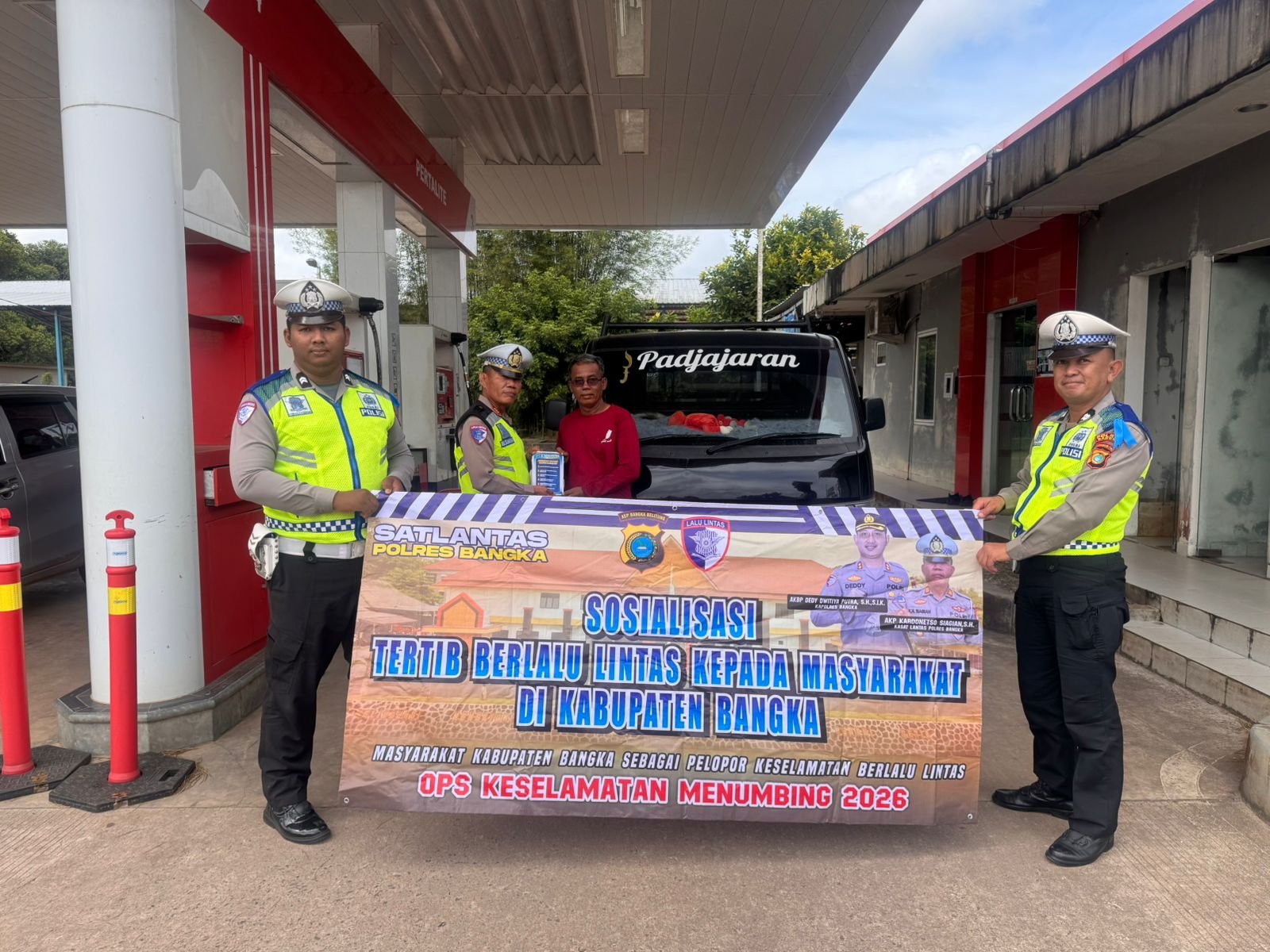 CyberNewsBangka – Dalam rangka mendukung pelaksanaan Operasi Keselamatan Menumbing Tahun 2026, personel Satuan Lalu Lintas (Satlantas) Polres Bangka melaksanakan kegiatan himbauan dan peneguran kepada pengguna jalan, disertai pembagian brosur serta penempelan stiker keselamatan lalu lintas.Kegiatan tersebut dilaksanakan diwilayah hukum Polres Bangka. Minggu (8/2/2026).