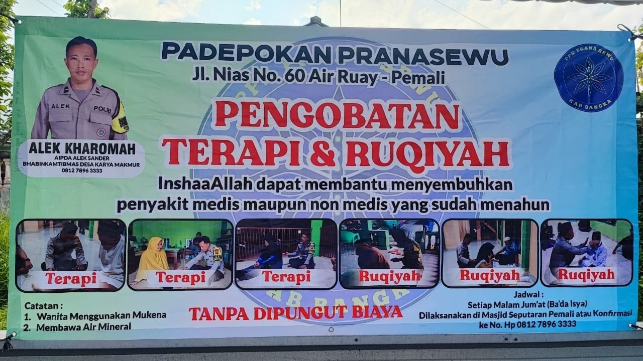 โRuqiah sudah lama saya lakukan. Sejak 2018, kegiatan ini sudah dilaporkan ke Polda Kepulauan Bangka Belitung sebagai agenda rutin saya di Desa Karya Makmur,โ kata Aipda Alek saat ditemui di sela-sela kegiatannya meruqiah warga, Senin (13/10/2025).